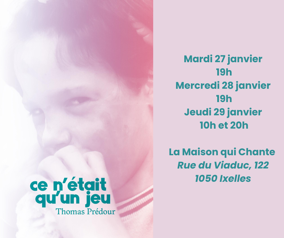 Après « NinaLisa » et « Une autre histoire », spectacles traitant déjà de thèmes de société tels que le racisme et le capitalisme, Thomas Prédour crée un duo théâtral et musical pour tenter de mettre des mots sur un sujet tabou, l’inceste. Dans une forme relativement brève (50 minutes) pour être accessible à toutes et tous dès 15 ans, il est sur scène avec la multi-instrumentiste Véronique Delmelle (saxophone alto, saxophone baryton et violon).